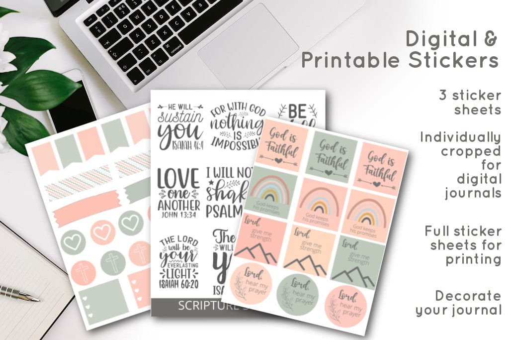 - Digital stickers to decorate your journal (in individual png form to insert in your digital journal and a full sheet to print and use with the printable journal).