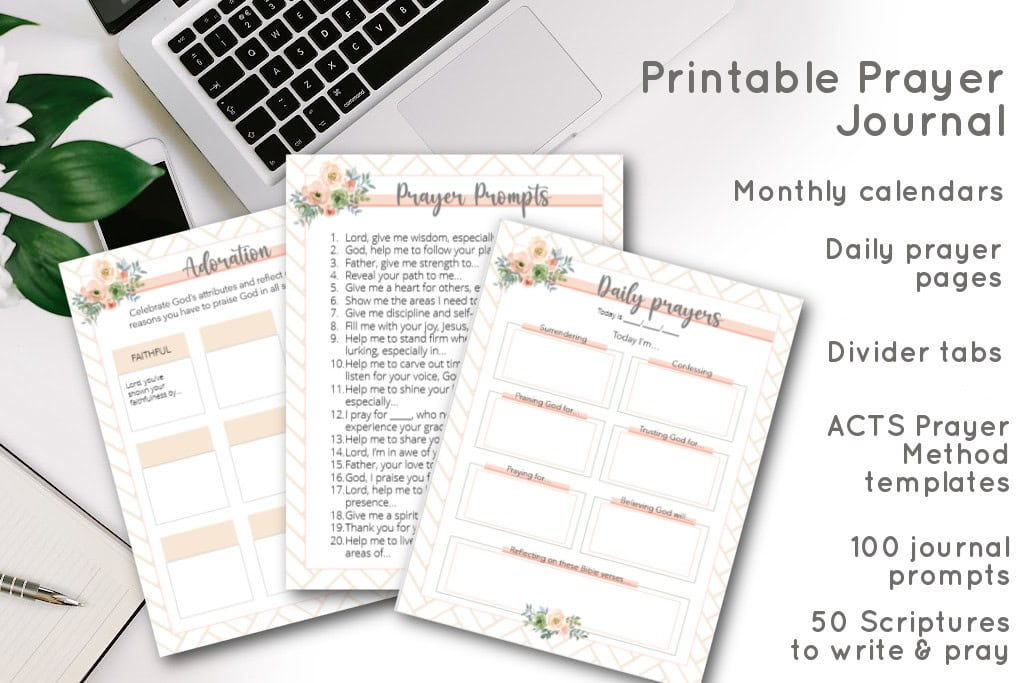 - Prayer journal sections for the ACTS method of prayer (Adoration, Confession, Thanksgiving, Supplication)