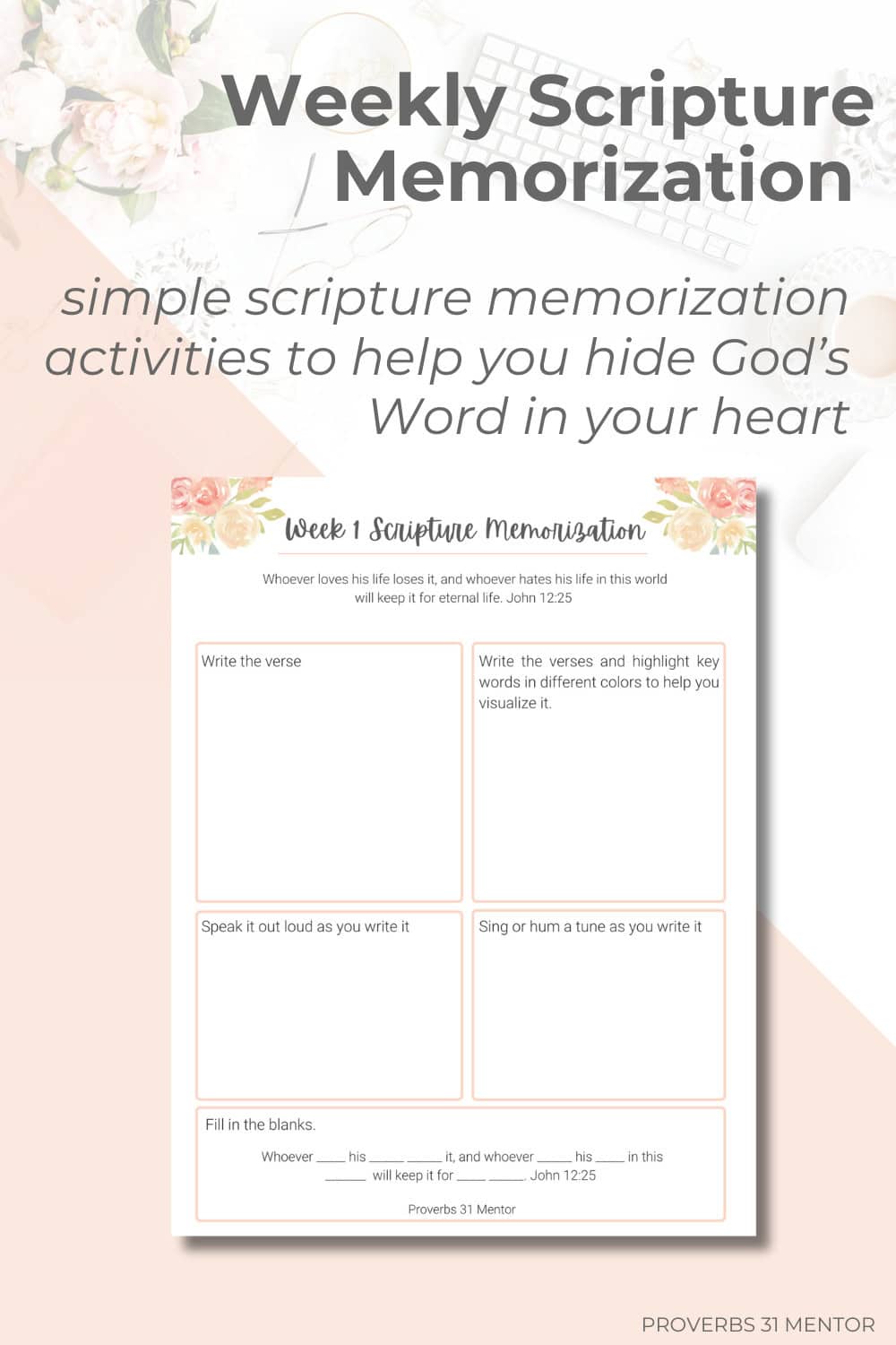 - Weekly scripture memorization activities to help you seamlessly memorize God’s Word in a meaningful way.